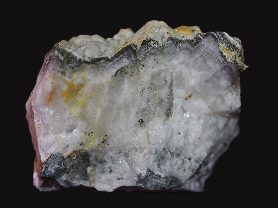 A heavy quartz and peach matrix with coarse cassiterite crystals throughout.